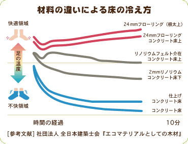 木の床は最初少し足の温度が下がってもじわじわと上がりますが、コンクリート床はどんどん下がって不快に感じます。