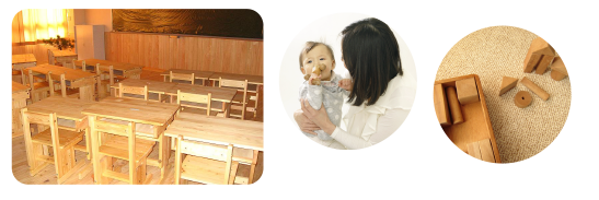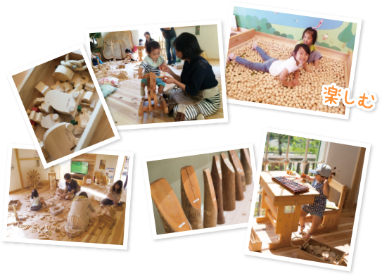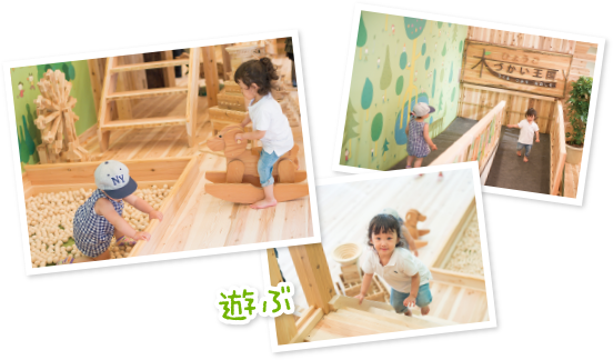 王国学校には、木のおもちゃがいっぱい。木のやさしい感触や香りにあふれた「木の玉プール」や「つみ木」、秘密基地のような「ツリーハウス」など「木づかい体験コーナー」で子どもの五感を磨きましょう。